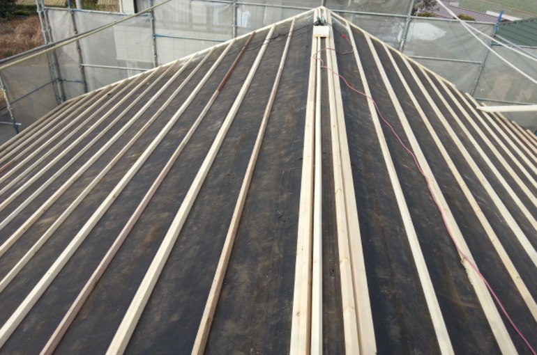 破風板を取り付けしています。それ終わったら、野地板を張ってルーフィング。