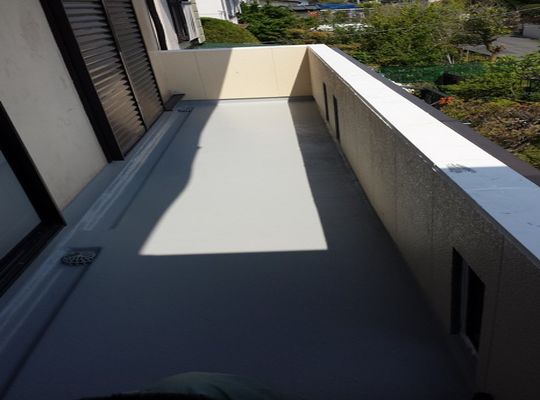 2015/02/20FRP防水作業が終了後バルコニー内壁のサイディングを貼って、 鉄骨笠木の上にもフレキを貼って、更に防水 鉄骨笠木の上に載せたフレキ、ただ... -